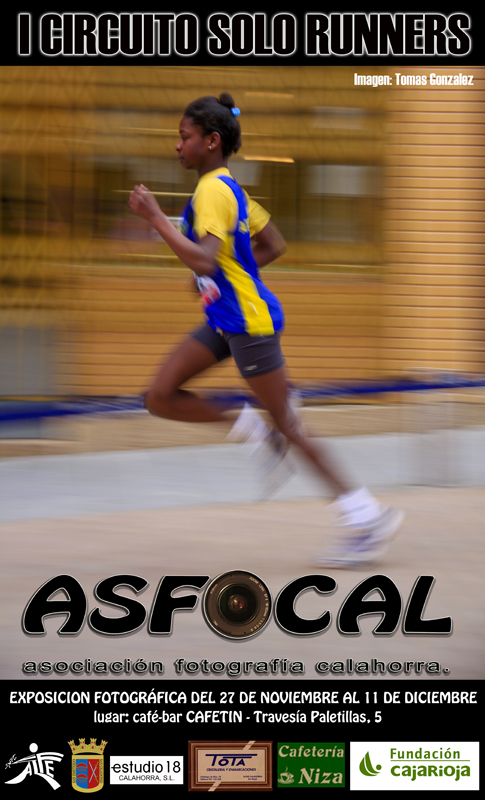 La organización del Circuito de carreras populares SOLO RUNNERS y la Asociación Fotográfica de Calahorra, ASFOCAL, han colaborado para llevar a cabo una exposición fotográfica sobre el I Circuito Solo Runners compuesto de cinco pruebas de fondo que se disputaron en las localidades de Aldeanueva de Ebro, Aguilar del Rio Alhama, Calahorra, Sartaguda y Quel. La exposición tendrá lugar en el café-bar Cafetín de Calahorra localizado en Travesía Paletillas nº5 y se podrá visitar del 27 de Noviembre al 11 de Diciembre de 2009 y contará con 20 imágenes que reflejan los trazados por donde discurren las distintas pruebasy la dureza de las mismas reflejada en los corredores.