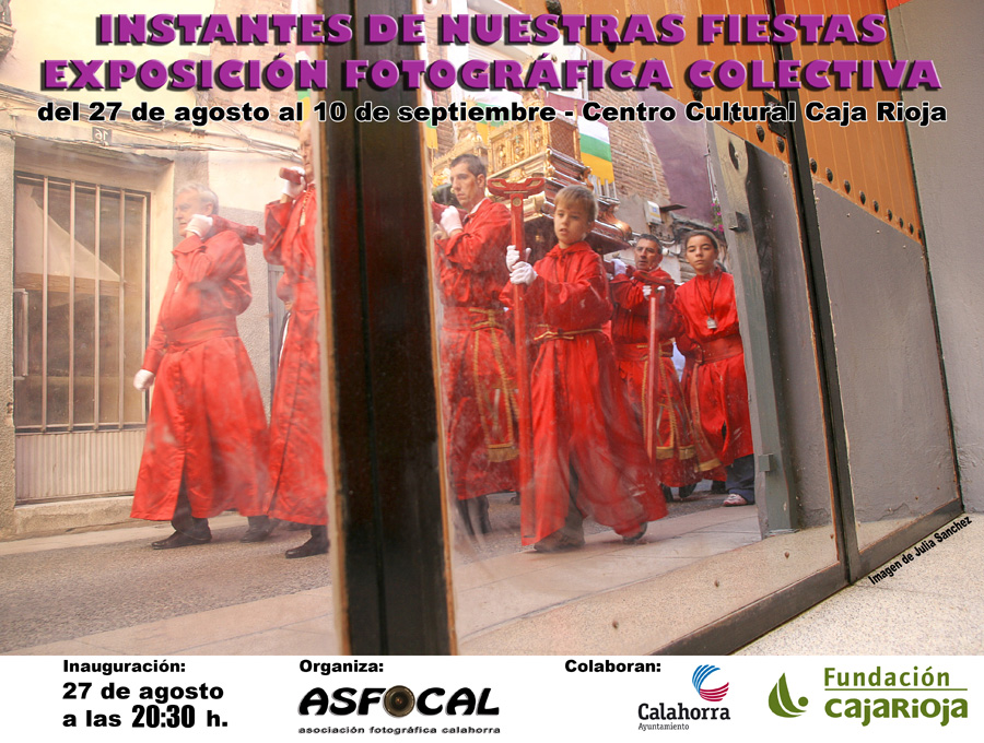 La muestra consta de 36 imágenes en gran formato (50×70) de varios socios de Asfocal y se podrá ver en el Centro Cultural CajaRioja del 27 de agosto al 10 de septiembre. Estáis todos invitados a la inauguración el lunes 27 a las 20:30 horas para disfrutar de un ‘vino español’ y del ambiente festivo de nuestra ciudad. ¡FELICES FIESTAS!
