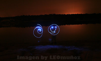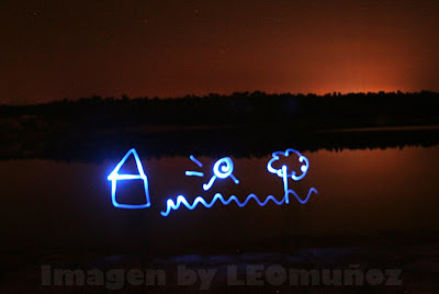 Serie «Light Painting». Espero, por lo menos, haberos sorprendido un pelín con mi primer «Light Painting», os explico. Hace tiempo que pillé en YouTube unos videos sobre esta técnica que trata de como hacer imágenes originales pintando con luz. Es decir, tu colocas el trípode en un lugar totalmente a oscuras o casi a oscuras y prepáras la cámara para una larga exposición, de 20 segundos en adelante (las fotos que véis en este post están tiradas a 30 segundos) y frente al objetivo tenemos al artista en cuestión (en mi caso a mi ‘grafitera aérea’ Micaela) dispuesto a encender una pequeña fuente de luz (llámese led, linterna, móvil, etc…) y a dibujar en el aire lo que se le ocurra. A partir de aquí la imaginación puede volar y currandose un poquito el tema se pueden hacer cositas un poco más decentes que lo que yo os he colgado aquí. Pero bueno, esta es la primera vez que hacemos «Light Painting» Micaela y yo y prometemos perfeccionar la técnica y mostraros nuestros avances. Venga, ya podeís empezar a probar en la pared de vuestra habitación.