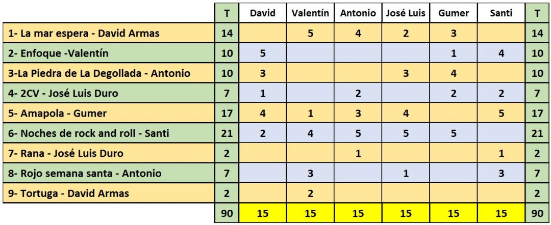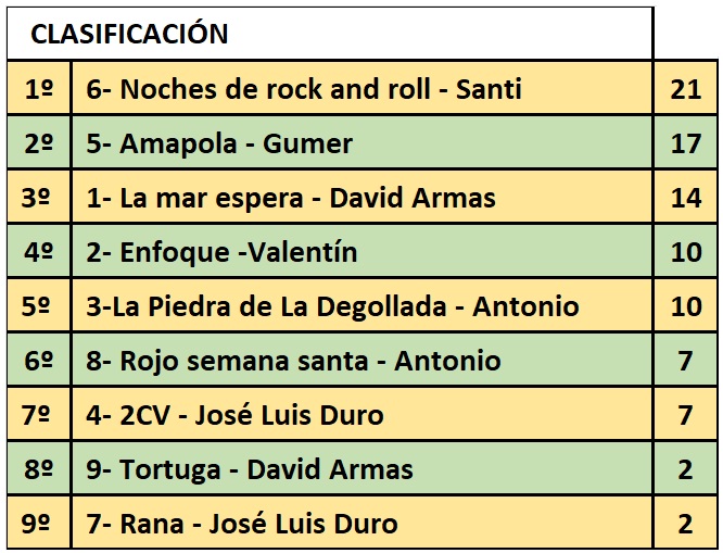 VOTACIÓN POR PUNTOS DE LOS PARTICIPANTES: este sistema es el sistema habitual de votaciones que siempre hemos utilizado. Para agilizar la resolución del mismo la votación debe enviarse a 12meses12fotosasfocal@gmail.com junto con el nombre de cada participante, en los 5 días siguientes al 28 de cada mes, que es cuando se cierra cada convocatoria (a las 23:59). Todos los participantes están obligados a votar dentro del plazo indicado, siendo eliminado de la convocatoria de ese mes si no lo hace y los puntos que le hayan otorgado serán retirados y no computarán. Se otorgarán 5, 4, 3, 2 y 1 punto a las cinco mejores fotos según vuestro criterio de entre todas las presentadas, entendiendo el ‘5’ como la mejor foto y el ‘1’ como la menos valorada. En caso de empate a puntos de dos o mas fotografias, ganará la que mayor número de puntuaciones altas haya obtenido. Todas las fotos estarán numeradas correlativamente e irán acompañadas del título de la misma, si el autor ha titulado la obra.