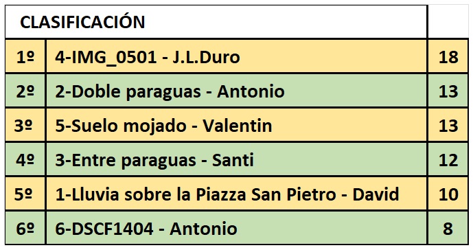 VOTACIÓN POR PUNTOS DE LOS PARTICIPANTES: este sistema es el sistema habitual de votaciones que siempre hemos utilizado. Para agilizar la resolución del mismo la votación debe enviarse a 12meses12fotosasfocal@gmail.com junto con el nombre de cada participante, en los 5 días siguientes al 28 de cada mes, que es cuando se cierra cada convocatoria (a las 23:59). Todos los participantes están obligados a votar dentro del plazo indicado, siendo eliminado de la convocatoria de ese mes si no lo hace y los puntos que le hayan otorgado serán retirados y no computarán. Se otorgarán 5, 4, 3, 2 y 1 punto a las cinco mejores fotos según vuestro criterio de entre todas las presentadas, entendiendo el ‘5’ como la mejor foto y el ‘1’ como la menos valorada. En caso de empate a puntos de dos o mas fotografias, ganará la que mayor número de puntuaciones altas haya obtenido. Todas las fotos estarán numeradas correlativamente e irán acompañadas del título de la misma, si el autor ha titulado la obra.