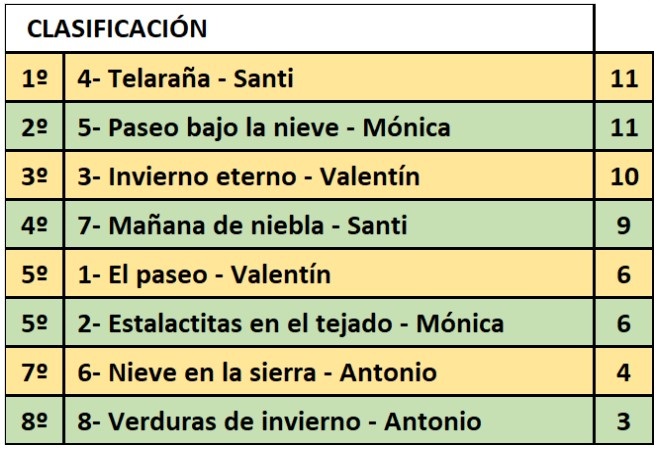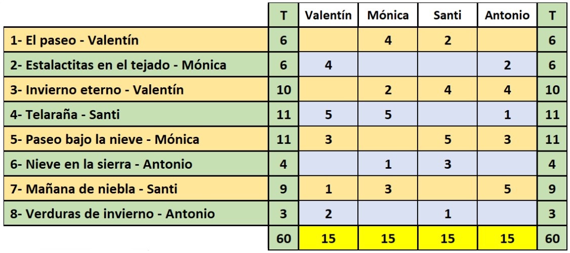 VOTACIÓN POR PUNTOS DE LOS PARTICIPANTES: este sistema es el sistema habitual de votaciones que siempre hemos utilizado. Para agilizar la resolución del mismo la votación debe enviarse a 12meses12fotosasfocal@gmail.com junto con el nombre de cada participante, en los 5 días siguientes al 28 de cada mes, que es cuando se cierra cada convocatoria (a las 23:59). Todos los participantes están obligados a votar dentro del plazo indicado, siendo eliminado de la convocatoria de ese mes si no lo hace y los puntos que le hayan otorgado serán retirados y no computarán. Se otorgarán 5, 4, 3, 2 y 1 punto a las cinco mejores fotos según vuestro criterio de entre todas las presentadas, entendiendo el ‘5’ como la mejor foto y el ‘1’ como la menos valorada. En caso de empate a puntos de dos o mas fotografias, ganará la que mayor número de puntuaciones altas haya obtenido. Todas las fotos estarán numeradas correlativamente e irán acompañadas del título de la misma, si el autor ha titulado la obra.