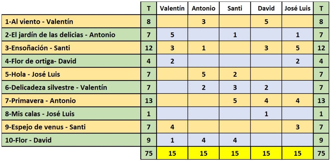 VOTACIÓN POR PUNTOS DE LOS PARTICIPANTES: este sistema es el sistema habitual de votaciones que siempre hemos utilizado. Para agilizar la resolución del mismo la votación debe enviarse a 12meses12fotosasfocal@gmail.com junto con el nombre de cada participante, en los 5 días siguientes al 28 de cada mes, que es cuando se cierra cada convocatoria (a las 23:59). Todos los participantes están obligados a votar dentro del plazo indicado, siendo eliminado de la convocatoria de ese mes si no lo hace y los puntos que le hayan otorgado serán retirados y no computarán. Se otorgarán 5, 4, 3, 2 y 1 punto a las cinco mejores fotos según vuestro criterio de entre todas las presentadas, entendiendo el ‘5’ como la mejor foto y el ‘1’ como la menos valorada. En caso de empate a puntos de dos o mas fotografias, ganará la que mayor número de puntuaciones altas haya obtenido. Todas las fotos estarán numeradas correlativamente e irán acompañadas del título de la misma, si el autor ha titulado la obra.